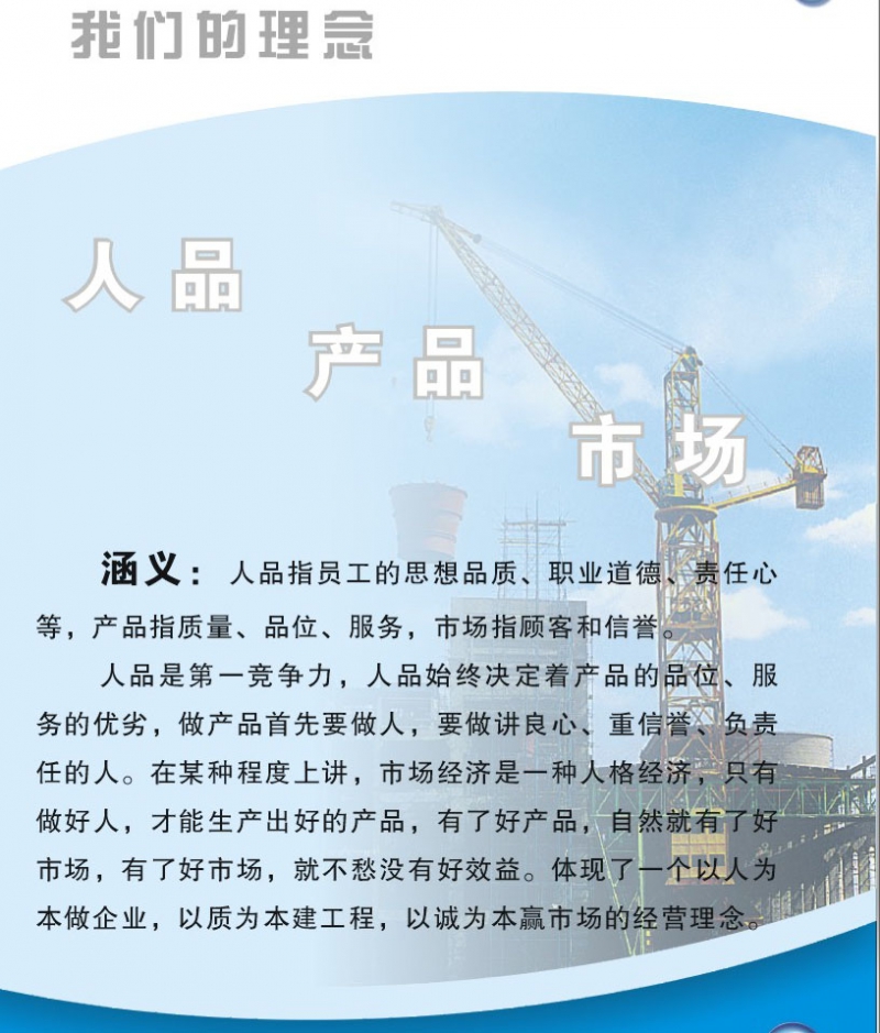 人品是第一競爭力,人品始終決定著產(chǎn)品的品位,服務(wù)的優(yōu)劣,做產(chǎn)品首先要做人,要做講良心、重信譽、負(fù)責(zé)任的人,在某種程度上講,市場經(jīng)濟是一種人格經(jīng)濟,只有做好人,才能生產(chǎn)出好的產(chǎn)品,有了好產(chǎn)品,自然就有了好市場,有了好市場,就不愁沒有好效益。體現(xiàn)了一個以人為本做企業(yè),以質(zhì)為本建工程,以誠為本贏市場的經(jīng)營理念。
