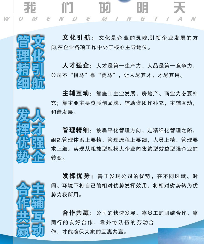4、企業(yè)文化是企業(yè)發(fā)展戰(zhàn)略規(guī)劃的重要組成部分,公司的發(fā)展戰(zhàn)略是:文化引航、人力強(qiáng)企、主輔互動、精細(xì)管理、發(fā)揮優(yōu)勢、合作共贏。